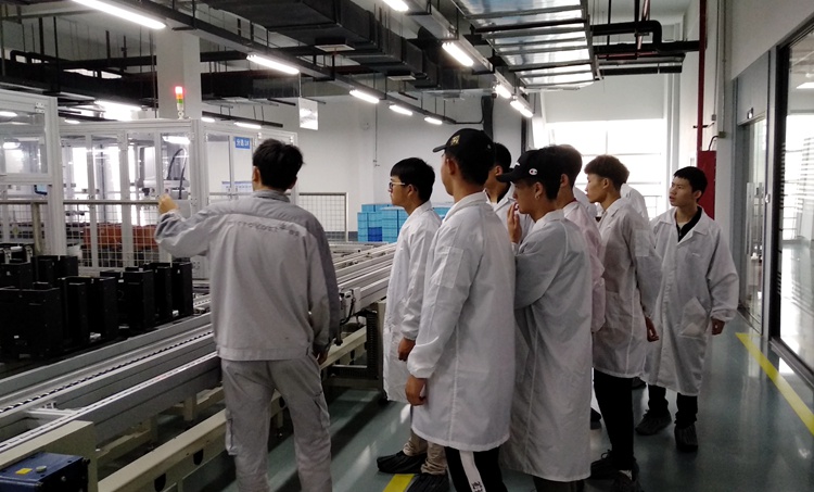 在PACK生产车间参观时,同学们对车间的环境要求之高很是惊讶,居然要换上规定参观用的白大褂,还要穿上鞋套才能参观车间,进入车间后同学们也对车间里的自动化生产设备兴致很高。参观结束后,告知微宏班的同学刚才参观的PACK生产车间,还不是公司自动化程序最高的车间时,同学们都露出惊讶的表情,都表示对所学专业的有了更进一步的了解,也对专业的发展前景充满信心。