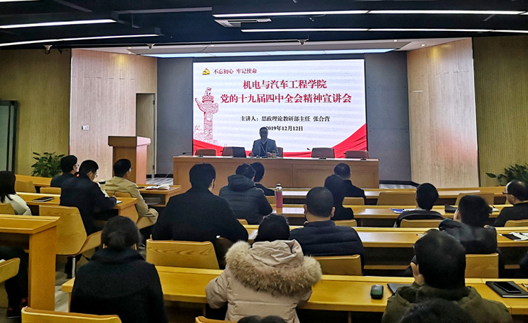 为进一步深入学习贯彻、全面准确领会党的十九届四中全会精神,12月12日下午,机电与汽车工程学院召开党的十九届四中全会精神宣讲会,思政理论教研部主任张合营应邀为学院全体教师作专题辅导报告。