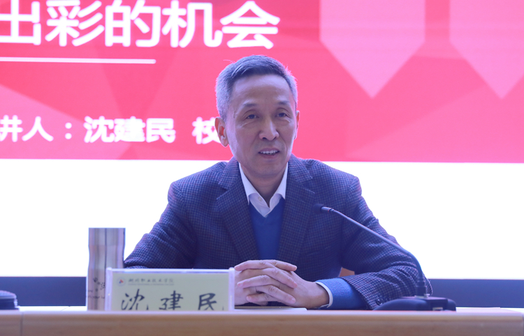 沈建民用翔实的数据和丰富的图表为同学们介绍了浙江省重点做大做强信息、环保、健康、旅游、时尚、金融、高端装备制造、文化等八大万亿产业,深入实施数字经济“一号工程”,以“数字产业化、产业数字化”为主线,全面推行智能制造的情况和湖州市以“中国制造2025”试点示范城市建设为牵引,聚焦数字经济和绿色智造,重点做大做强新能源汽车及关键零部件、高端装备等新兴、优势产业,着力构建“4+4”实体经济体系的发展建设情况。他还结合我校实际,介绍了我校推进产教融合校企协同育人和学生近年来就业创业情况。