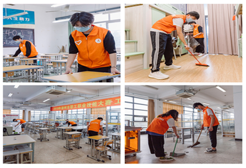 镜头二:实训室是学院学子训练动手能力、提高综合能力的重要场所,实训室的清洁干净关系着同学们的健康安全。打扫实训室卫生时,同学们明确分工,相互配合,一齐上阵,对实训台面、设备仪器、地面和门窗等部位都进行了全面细致深入的清理,确保做到全方位不留卫生死角。