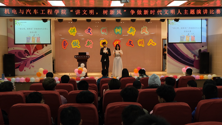 为热烈庆祝湖州市精神文明建设实现“连冠夺牌”,进一步培育学院青年学子正风正气和社会责任意识,唱响文明实践主旋律,践行社会主义核心价值观。11月23日晚,机电与汽车工程学院在一号楼三号报告厅举办“讲文明 树新风”争做新时代文明人主题演讲比赛决赛。校团委老师、学院辅导员及学生观众百余人参加了本次活动。