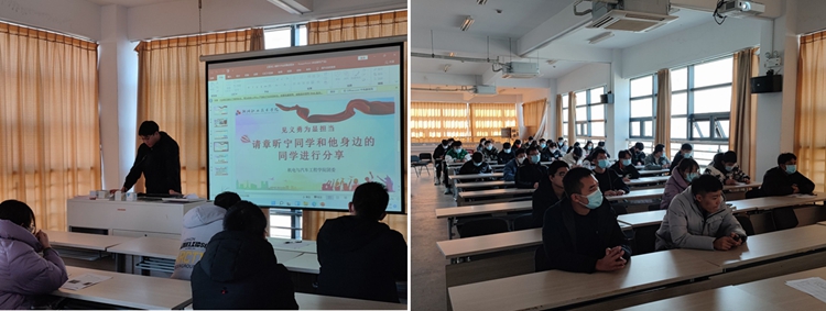 章昕宁同学向各班班长团支书分享了自己见义勇为的经过和心路历程,身临其境的回忆牵动着在场每一位同学的心,他为自己见义勇为的行为感到骄傲和自豪。他说:“此次个人三等功的荣誉,既是一份肯定,更是督促我奋进的动力。接下来,我将进一步坚定理想信念,认真学习专业知识,不断提升综合素质,以实际行动带动身边的同学共同进步,为实现中国梦贡献自己的青春力量。”活动中,章昕宁的室友和同学还分享了他在平时学习生活中的表现。在他们眼中,章昕宁同学学习认真、工作负责,会竭尽全力去完成自己的每一个目标任务,在生活中幽默风趣,会积极帮助身边的同学。