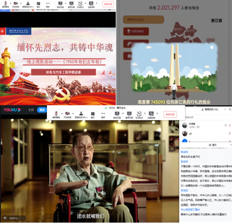 活动中,同学们通过浙江革命烈士纪念馆微信公众号,线上向革命英烈献花和行礼,表达自己对革命英烈的怀念与崇敬之情。线上祭奠结束后,学院组织开展了线上观影活动,带领同学们一起观看了电影《1950年他们正年轻》,影片以抗美援朝中不同军种,不同时期参战的老兵真人讲述,呈现出了这场立国之战的残酷以及他们曾经热血的青春与保家卫国的梦想。“革命先烈永垂不朽”,“哪有什么岁月静好,不过是有人替你负重前行”……同学们纷纷表达出自己对革命先烈,对参战老兵的敬仰之情。