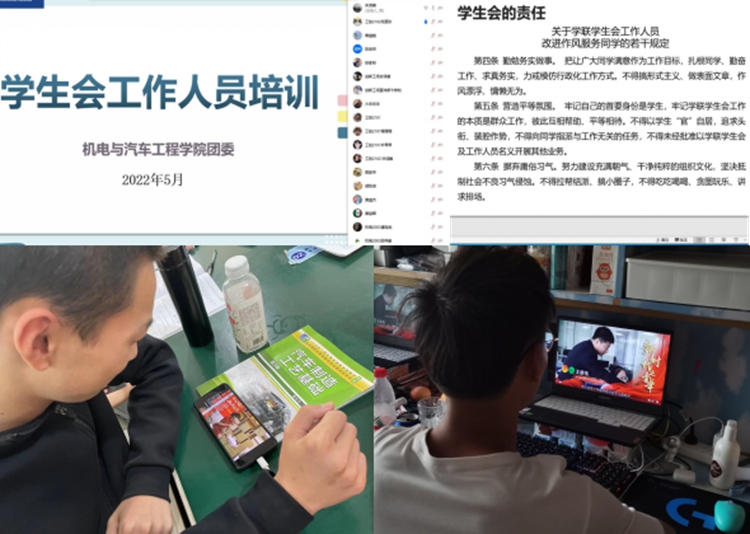 在线上培训活动中,学院辅导员结合习近平总书记在庆祝中国共产主义青年团成立100周年大会上的讲话、给中国航天科技集团空间站建造青年团队的回信,以及全国学联《关于学联学生会工作人员改进作风服务同学的若干规定》等文件要求,从加入学生会的初心、学生会的责任、学生会的凝聚力等方面进行阐述,引导广大学生干部要牢记践行为同学服务的宗旨,扎根同学,实心实意帮助同学解决困难。培训会还组织大家观看了近期在浙江大学举办的中国青年五四奖章分享会直播,引导大家学习榜样力量,坚定理想信念,努力践行中国青年的使命担当。