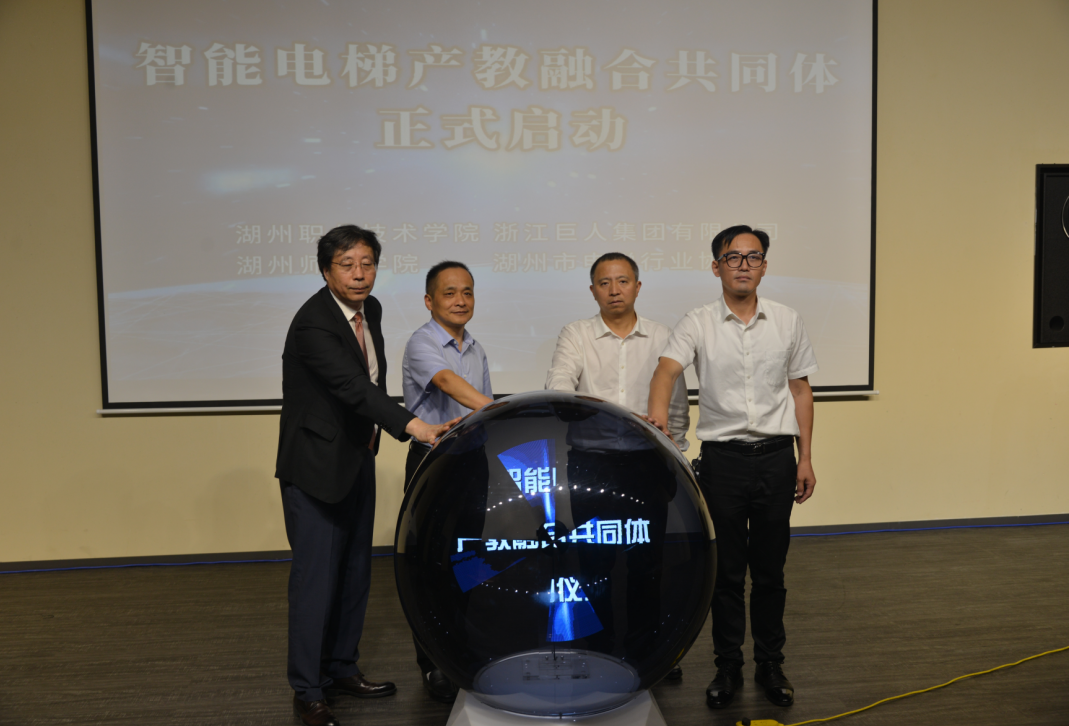 陆勤丰、钱江、唐培松、潘国强共同为智能电梯产教融合共同体开启启动仪式。智能电梯产教融合共同体由我校与浙江巨人集团有限公司、湖州师范学院和湖州市电梯行业协会共同牵头发起创建,联合70余家电梯企业,依托湖州电梯及零部件产业,开展电梯产业高技能人才培养、实习与就业,电梯产业教学资源开发、实训基地共建,电梯产业工人素质提升,职业院校双师素质提升等。