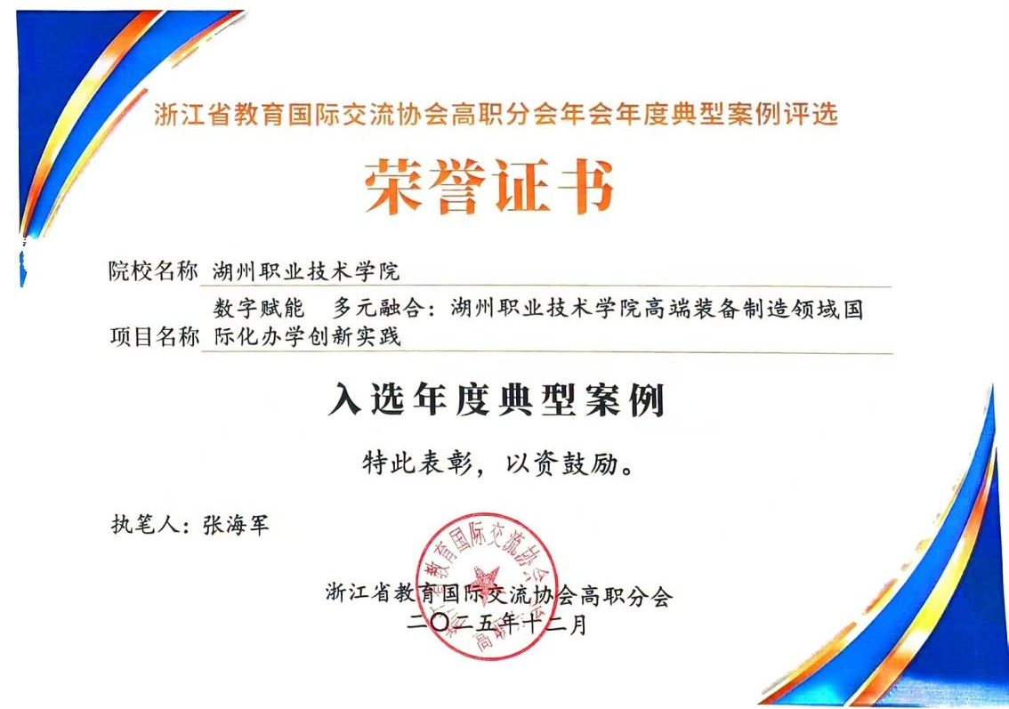 年会期间,浙江省教育国际交流协会高职分会发布了国际交流与合作年度典型案例。我校报送的案例《数字赋能 多元融合:湖州职业技术学院高端装备制造领域国际化办学创新实践》成功入选年度典型案例。